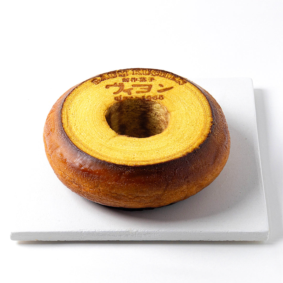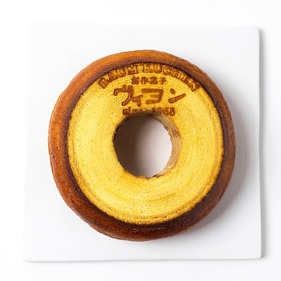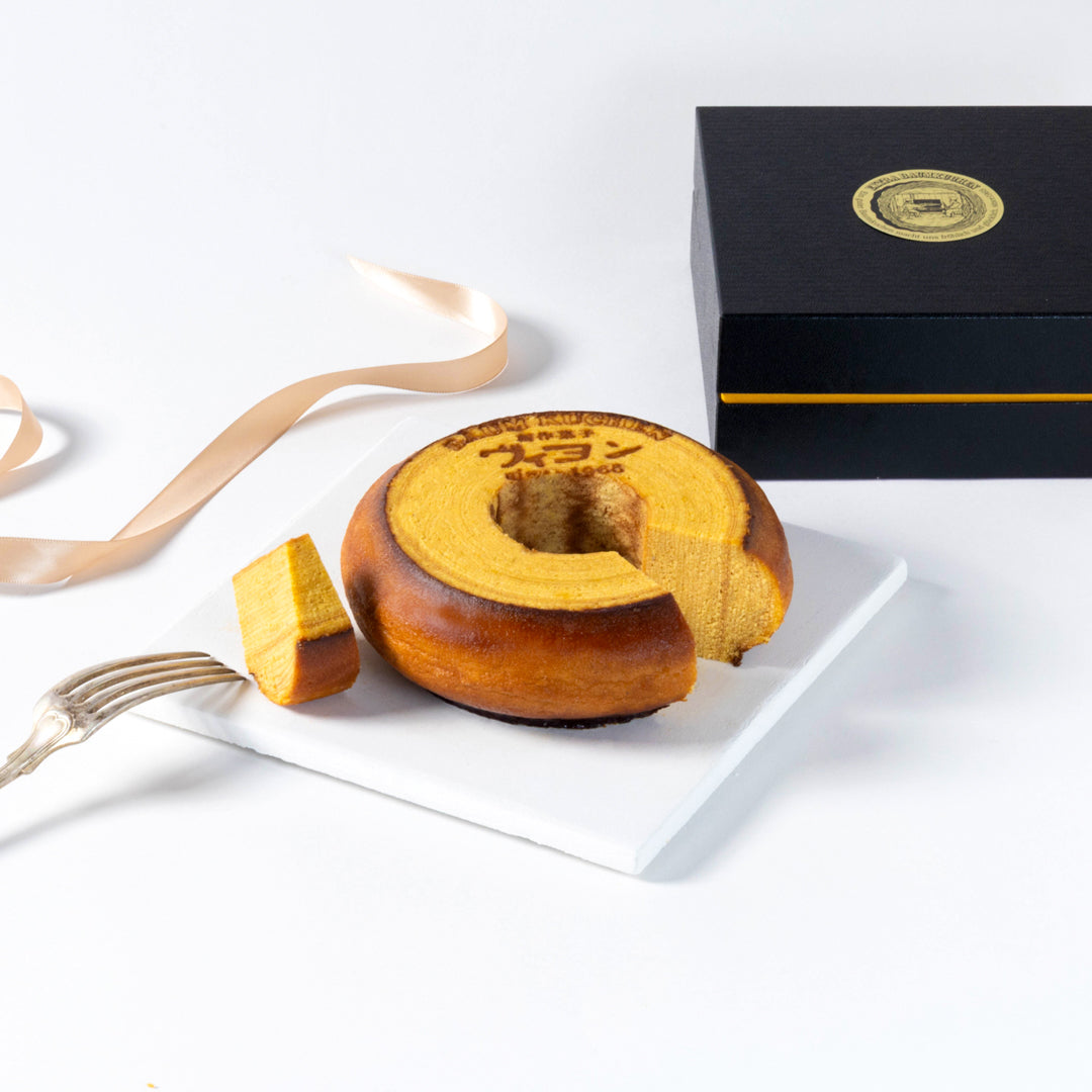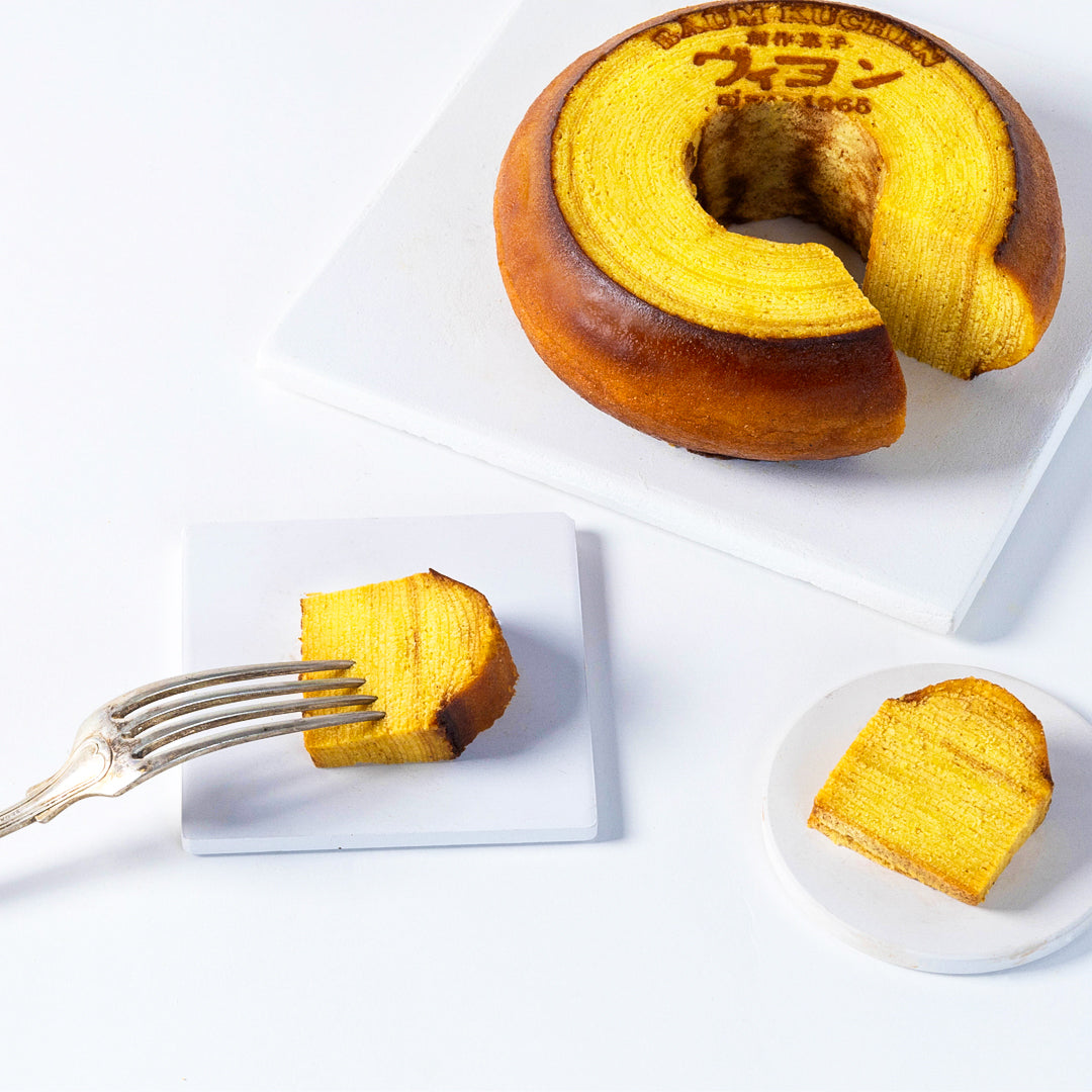 特選バウムクーヘンは、ゴールドアーモンドペーストとマダガスカル産のバニラビーンズえお使用した、芳醇な香りと深い味わいのある高級感あふれるバウムクーヘン。ヴィヨンの焼き印も入っています。定番のプレーンバウムクーヘンとの食べ比べもおすすめです。