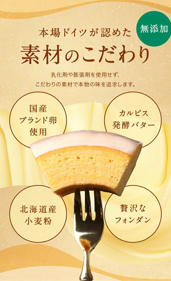 原材料名(プレーンバウムクーヘン小):卵(国産)、バター、砂糖、小麦澱粉、小麦粉、アーモンド、クリーム、ハチミツ、水飴、発酵乳、レモン、洋酒、米粉、ナツメグ、カルダモン、寒天、食塩/香料、(一部に乳成分・卵・小麦・アーモンドを含む)