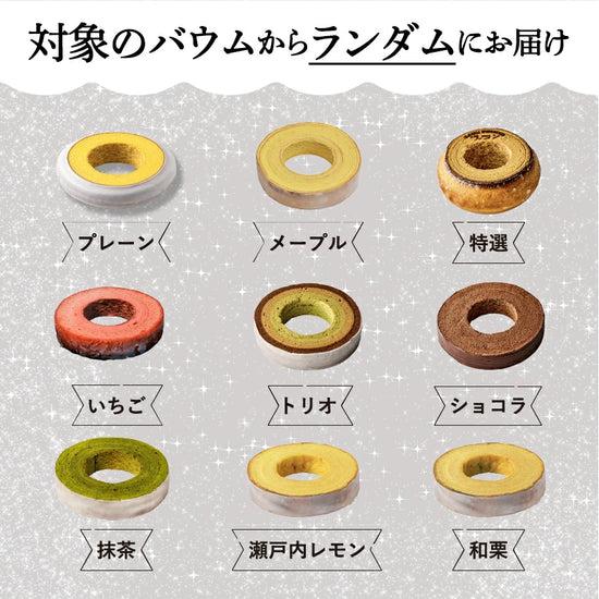 味は【プレーン/メープル/特選/いちご/トリオ/ショコラ/抹茶/瀬戸内レモン/和栗】の中からランダムにて発送させていただきます。簡易包装での発送となりますのでご理解ください。また、お手提げ袋の同梱ができかねます。